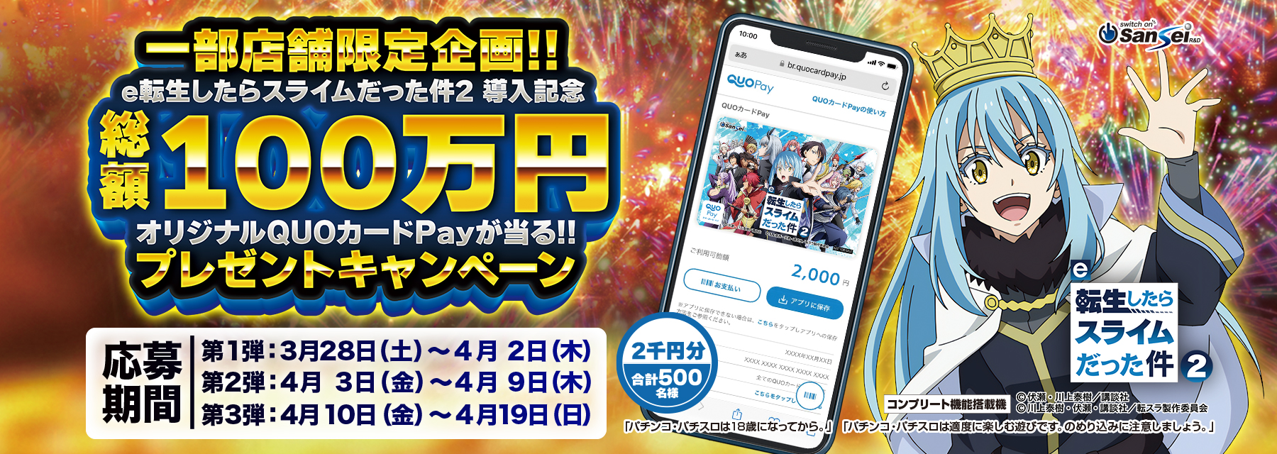 - 2026.04.01【e転生したらスライムだった件2】2026年04月06日(月)より全国導入開始!! 一部店舗限定企画!! 総額100万円!! オリジナルQUOカードPay(2,000円分)が当たるプレゼントキャンペーンを開催!!