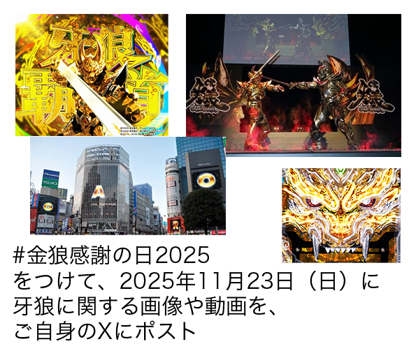 • ・「チャンス2」は【公式】サンセイアールアンドディ(@sansei_rd)をフォローしていただき、#金狼感謝の日2025 をつけて牙狼に関する画像や動画をご自身のXにポスト頂いた方を対象と致します。